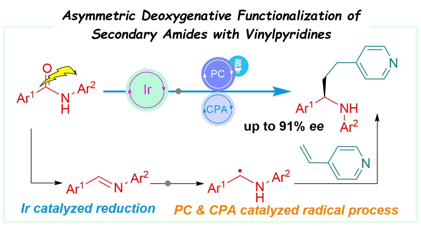 35. Deng, X.; Jiang, F.*; and Wang, X.*, Org. Lett. 2024, 26, 2483–2488. Asymmetric Deoxygenative Functionalization of Secondary Amides with Vinylpyridines Enabled by a Triple Iridium-Photoredox-Chiral Phosphoric Acid System.