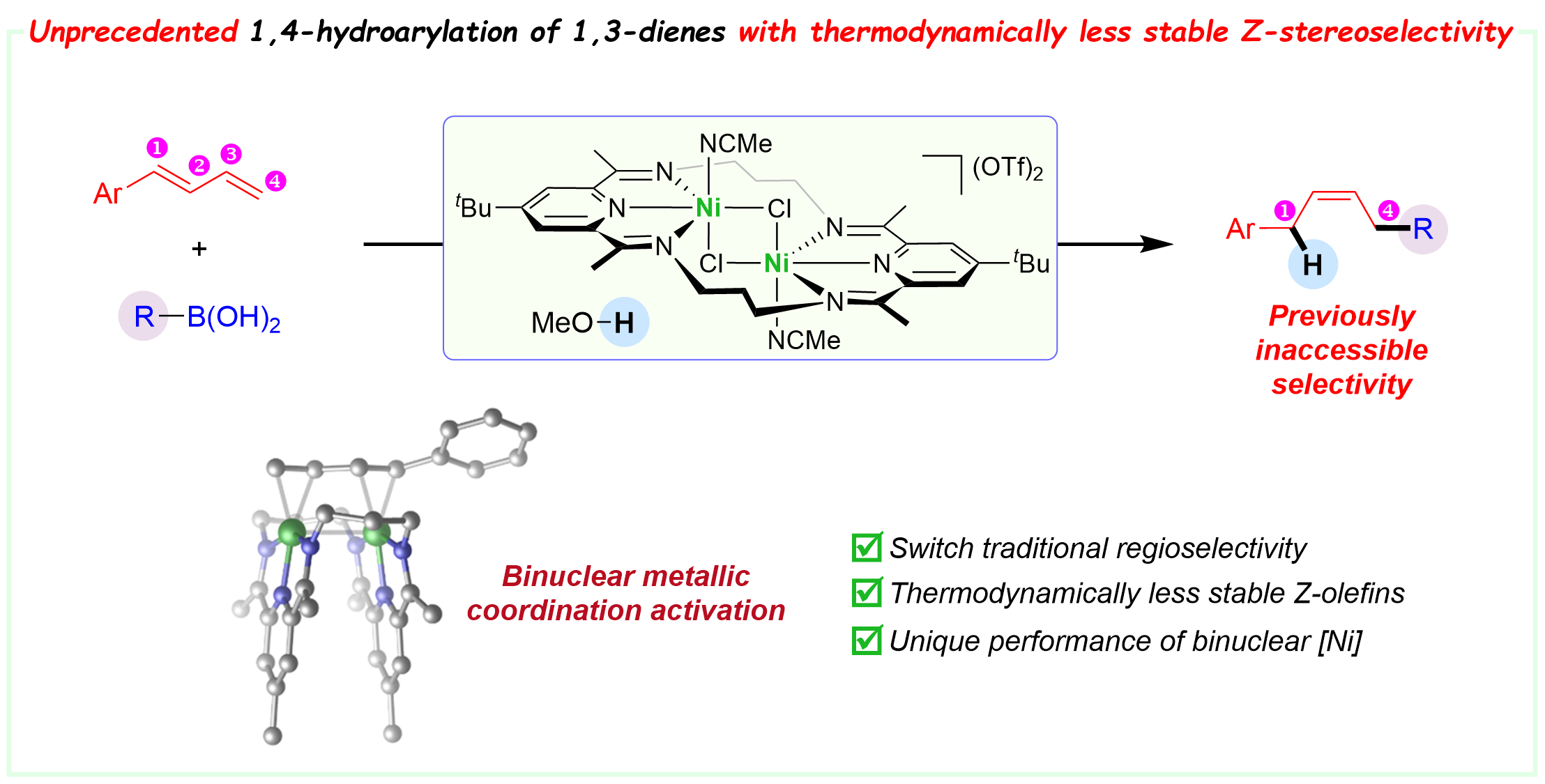 32. Chen, K#.; Zhu, H#.; Li, S.; Bai, J.; Guo, Y.; Ding, K.*; Peng, Q.*; Wang, X.*, J. Am. Chem. Soc. 2023, 145, 24877–24888. Switch in Selectivities by Dinuclear Nickel Catalysis: 1,4-Hydroarylation of 1,3-Dienes to Z-Olefins.