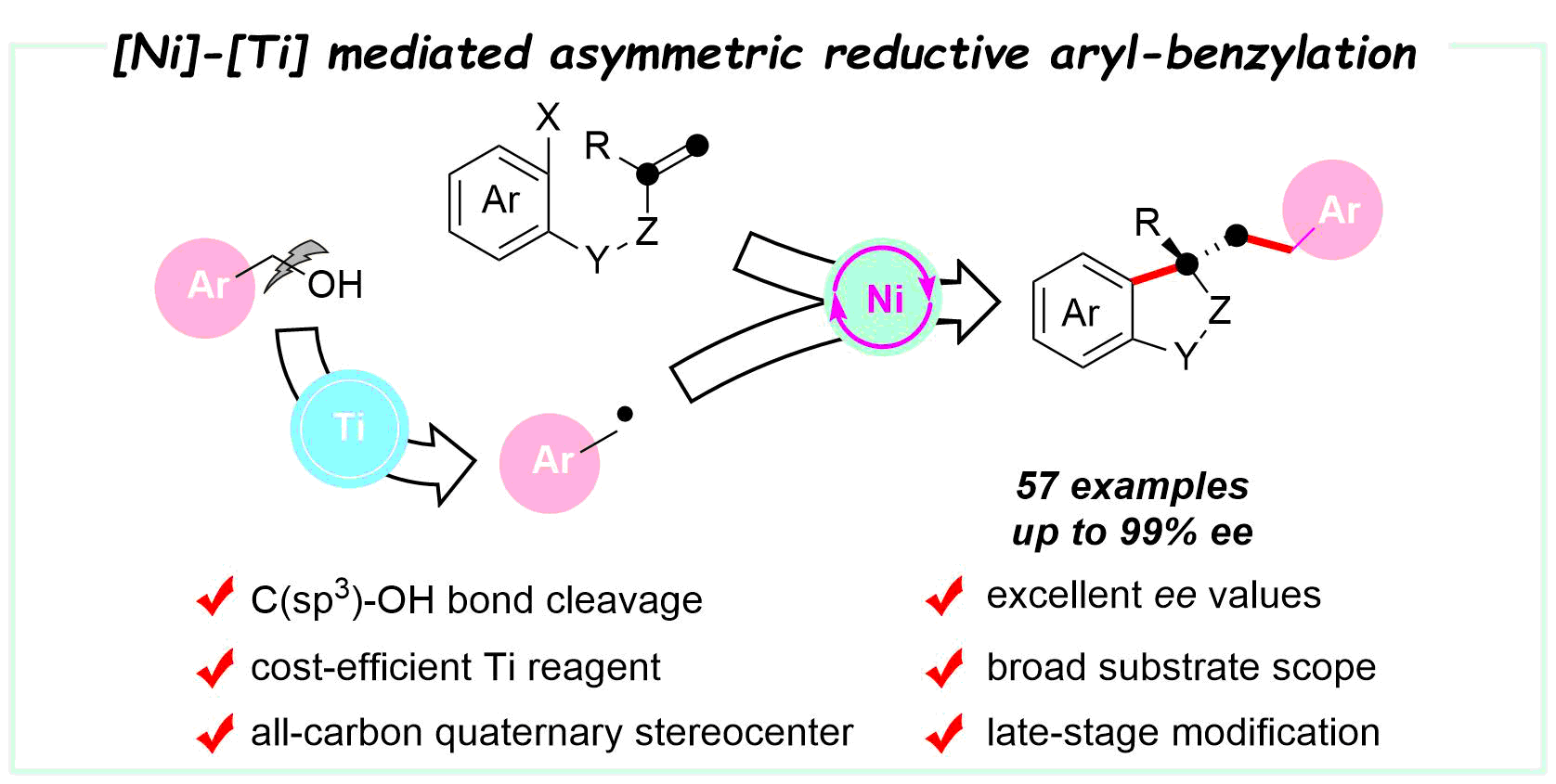 27. Zhao, C; Ge, Z.; Hu, J.; Tian, H.; Wang, X.*, Cell Rep. Phys. Sci. 2023, 4, 101474. Enantioselective reductive aryl-benzylation of alkenes by a nickel-titanium bimetallic system.