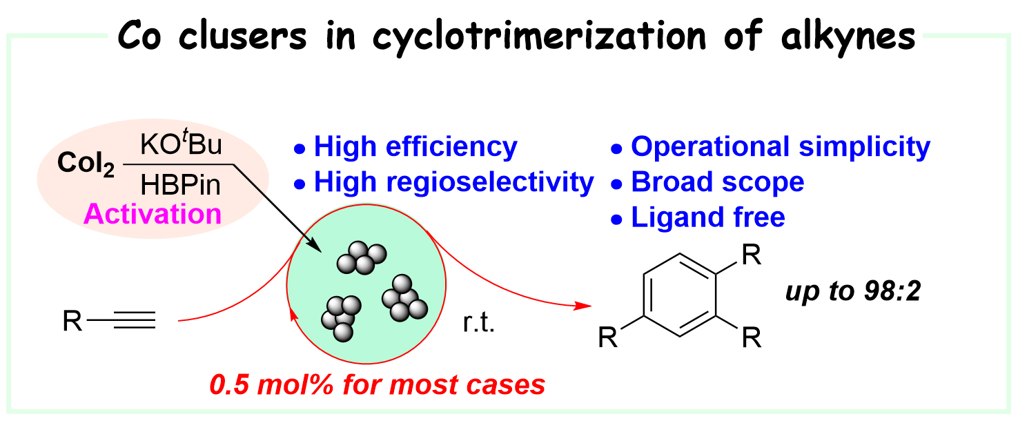 5. Song, S.; Li, C.; Liu, T.; Zhang, P.*; Wang, X.*, Org. Lett. 2021, 23, 6925-6930. H-BPin/KOtBu Promoted Activation of Cobalt Salt to a Heterotopic Catalystfor Highly Selective Cyclotrimerization of Alkynes.