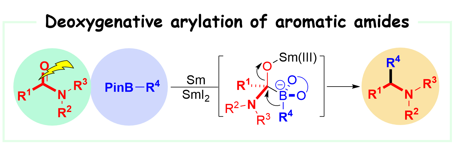 2. Jiao, J.; Wang, X.*, Angew. Chem. Int. Ed. 2021, 60, 17088-17093. Merging Electron Transfer with 1,2-Metalate Rearrangement: Deoxygenative Arylation of Aromatic Amides with Arylboronic Esters.