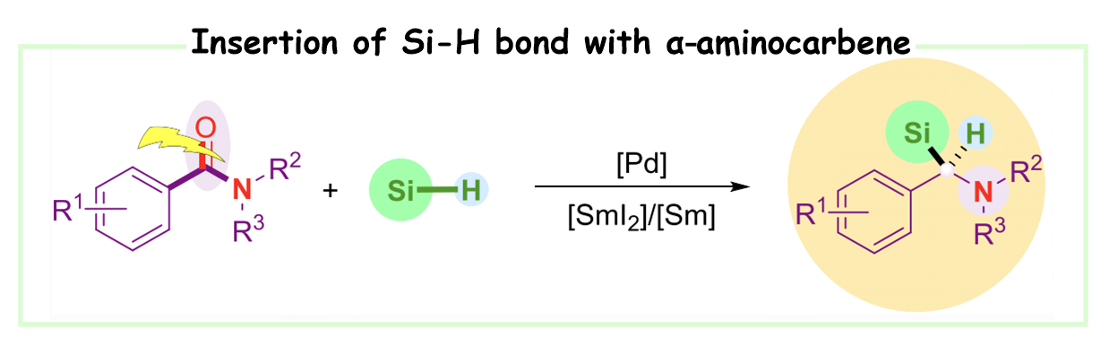 18. Jiao, J.; Yang W.; Wang, X.*, J. Org. Chem. 2023, 88, 594–601. α-Aminocarbene-Mediated Si–H Insertion: Deoxygenative Silylation of Aromatic Amides with Silanes.