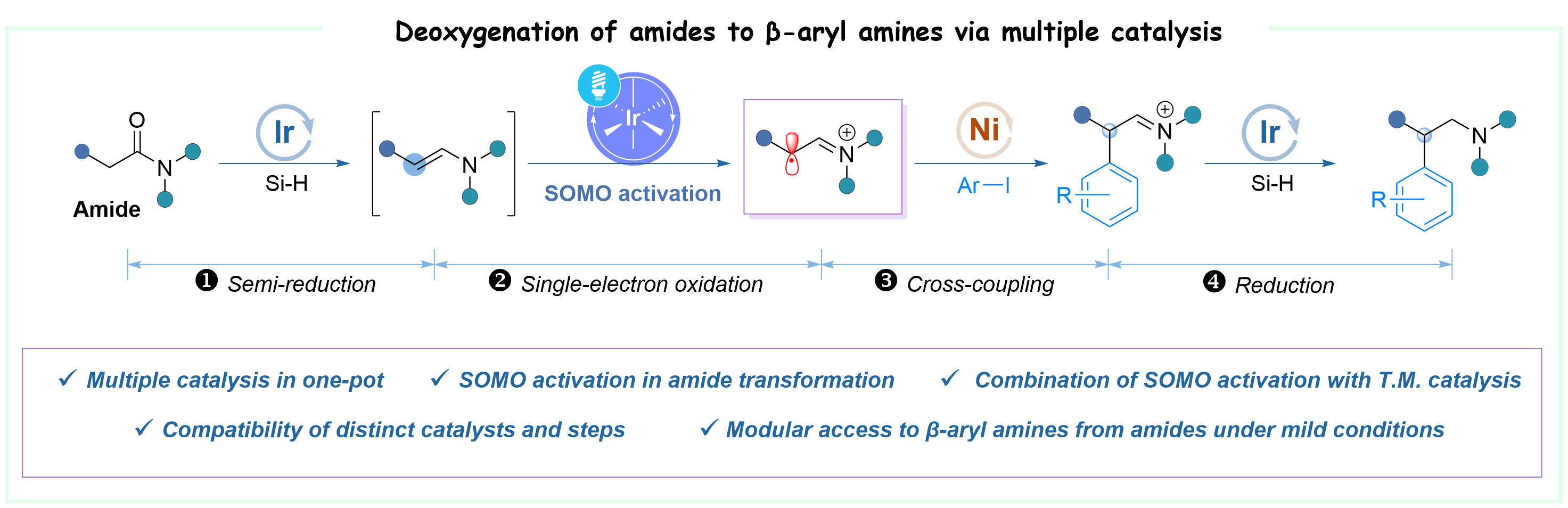 42. Tian, H.; Jiang, F.; Wang, X.*, Sci. Adv. 2025, 11, eadt4187. Merging SOMO Activation with Transition Metal Catalysis: Deoxygenative Functionalization of Amides to β-aryl Amines.