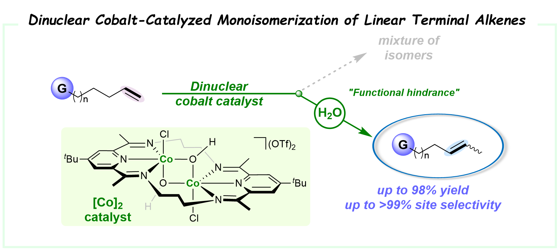 45. Wang, G.-Y.; Zhu, H.; Xu, Y.; Chen K.; Lin, J.; Peng, Q.; Wang, X.*, Organometallics 2025, 44, 1660−1669. Water-Driven Isomerization Control: Dinuclear Cobalt-Catalyzed Monoisomerization of Linear Terminal Alkenes.